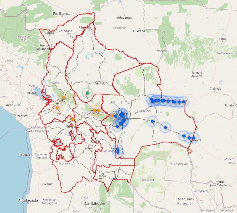 Im Osten, in der Provinz Ángel Sandoval, gibt es zwei Sperrpunkte; der erste auf der Brücke, die San Matías mit Las Petas verbindet. 90 km von der Hauptstadt Matieña entfernt befindet sich die zweite Blockade am Eingang zu Bolivien nördlich von San Matías.